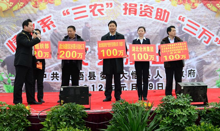 2012年,中共湖北省委、湖北省政府開展“萬名干部進萬村挖萬塘”,瑞信房地產(chǎn)開發(fā)公司積極響應(yīng)號召,為大悟縣“三萬”活動率先捐款100萬元,用于開塘挖堰,整治農(nóng)村用水環(huán)境。
